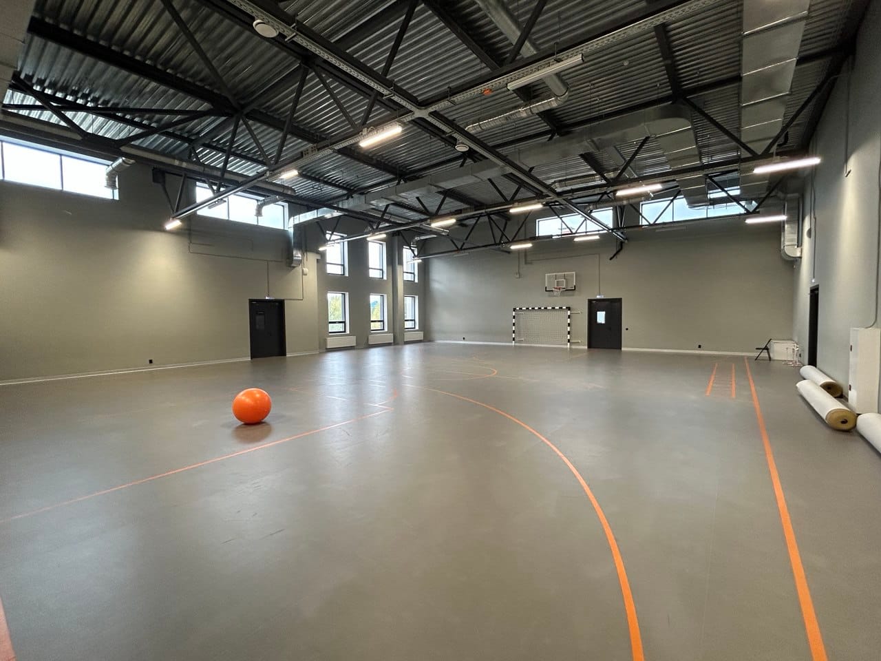 Просторный спортивный зал игровых видов спорта площадью 370 м². Высота потолка до балок — 5 метров.
